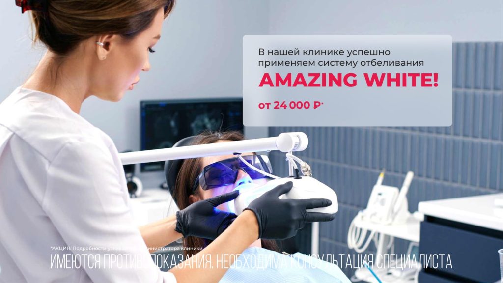 • Отбеливание зубов Amazing White — инновационная технология, дающая эффект до 8 тонов за одно посещение;